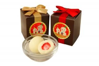クリスマスカラーがポイントのメリーBOX。ホワイトストロベリーチョコ2個入り。サイズ5×5.5×4.5cm。結婚式などに最適なプチギフト特集。