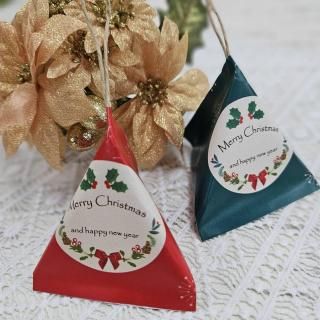 可愛い三角形デザインのクリスマスツリーオーナメント。サイズは7×6.5×7.5cm、内容はキラチョコ5個。2色アソートで、プチギフトに最適。職場のスタッフに喜ばれる贈り物です。