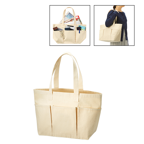 裏表に合計6つのポケットがついているので、小物も入れやすく使いやすいトートバッグです。