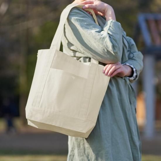 厚みのあるコットン生地のトートバッグにハンドルラインが特徴のバッグが登場しました。