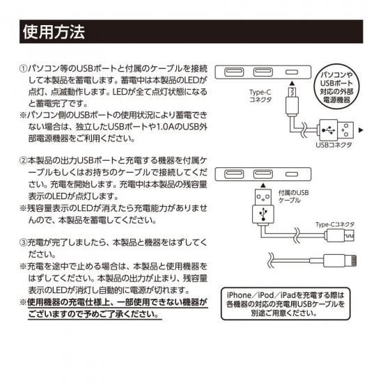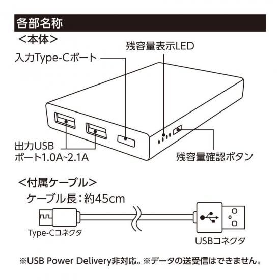 【付属品】取説付、最大出力2.1A、バッテリー容量5000mAh、本体重量約107g、スマートフォン約2.3回充電可能、TypeCケーブル付属,残量表示ランプ付