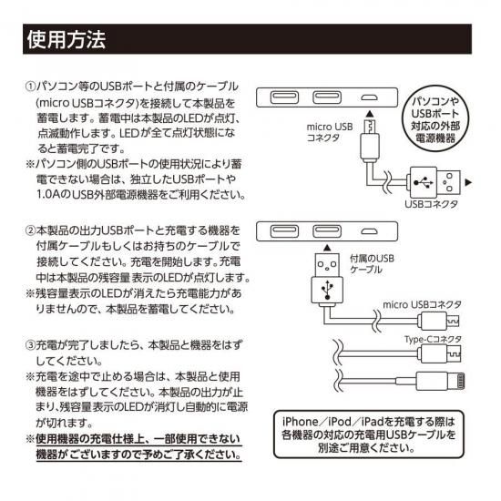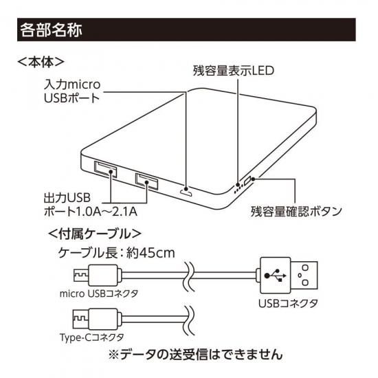 【付属品】取説付、最大出力2.1A、バッテリー容量6000mAh、本体重量約135g、スマートフォン約2.8回充電可能、micro USB・Type-Cケーブル付属