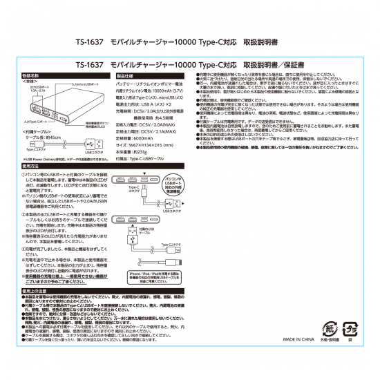 [MARKLESS STYLE] TS-1637 モバイルチャージャー 10000mAh Type-C対応