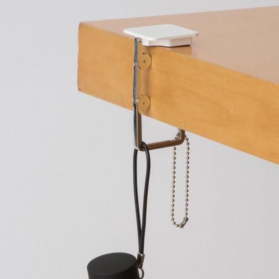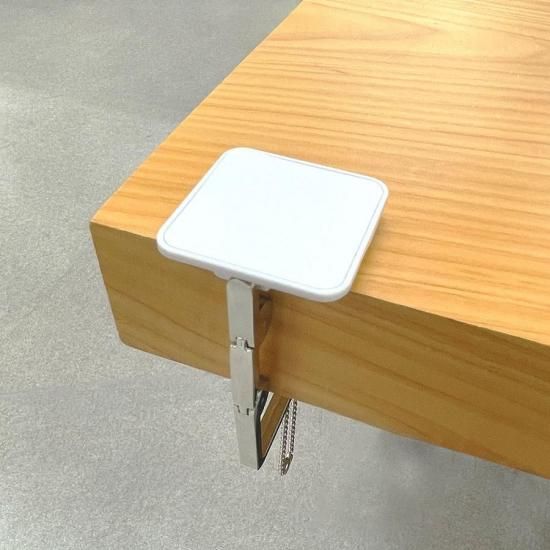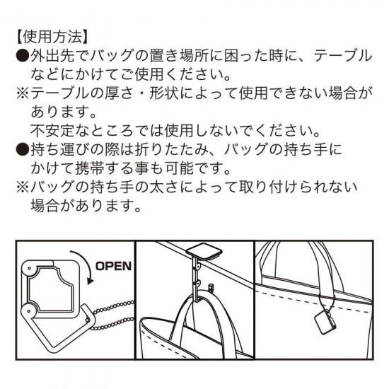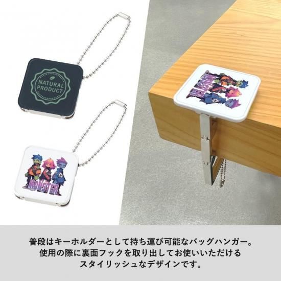 持ち運ぶ際にはキーホルダーとして、使用の際に裏面フックを取り出してお使いいただけるスタイリッシュなバッグハンガーです。