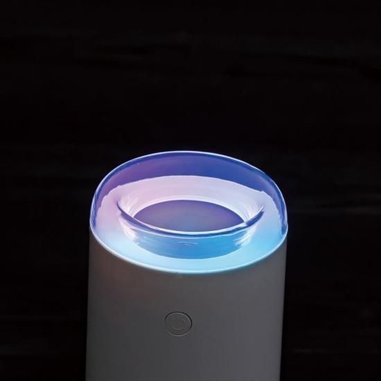 シンプルデザインの加湿器がデスクワークのお供。移ろいゆく光に癒されてください。