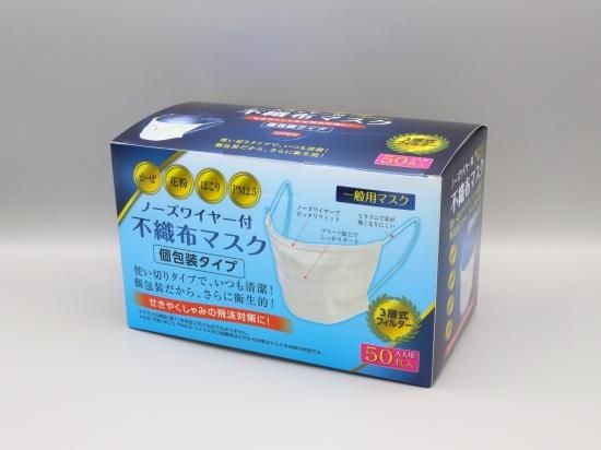 3層式フィルターノーズワイヤー付き不織布マスク。
