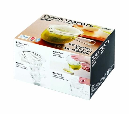 内容:ガラスのように透明だのに軽くて割れにくいクリアティーポット!洗っても歪まない丈夫なストレーナー!水切れがよく注ぎやすさ抜群!