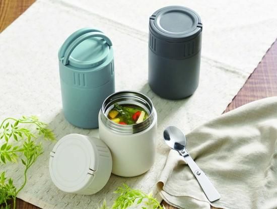 内容:持ち運びしやすい持ち手付き、小さく折りたたみできるステンレススプーン付き。ランチまで食べごろの温度をキープできる真空二重構造。