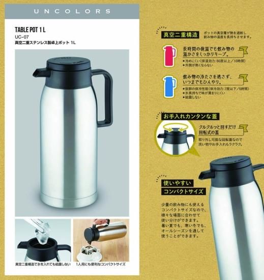 UC-07UNCOLORS-アンカラーズ-真空二重ステンレス卓上ポット1L