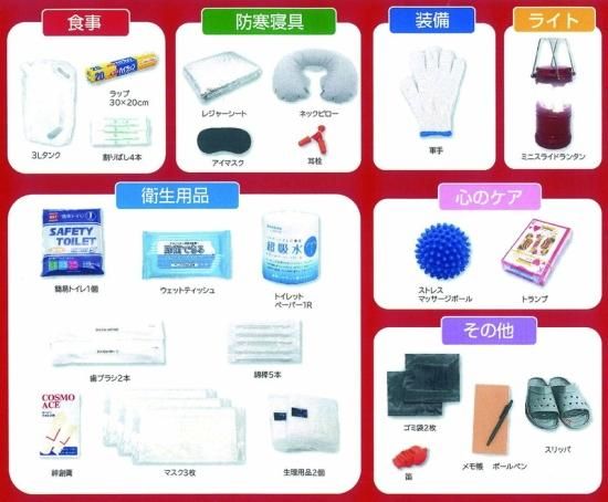 材質:トートバッグ/ポリエステル・アルミ蒸着フィルム、歯磨き成分/ソルビトール・炭酸Ca・シリカ・グリセリン・ラウリル硫酸Na・水・PG・キシリトール・セルロースガム・ハッカ油・キサンタンガム・ステビアエキス・香科、割りばし/アスペン、スライドランタン/PP・PS・スチール、スリッパ/EVA、ラップ/ポリエチレン、笛/ABS樹脂、耳栓/ポリウレタン、アイマスク/ポリエステル、ネックピロー/PVC・ポリエステル、不織布マスク/本体:ポリプロピレン不織布、ワイヤー:ポリエチレン、耳ひも:ポリウレタン・ポリエステル、メモ帳/紙、ボールペン/PP、トイレットペーパー/再生紙100%、抗菌ウェットティッシュ/レーヨン・ポリエステル不織布、トランプ/紙、軍手/ポリエステル、簡易トイレ/高分ポリマー・ポリエチレン、3Lタンク/ポリエチレン、ゴミ袋/ポリエチレン、レジャーシート/アルミ・ポリウレタン、生理用品/ポリエステル・ポリエチレン、綿棒/綿・紙、ストレスボールPVC