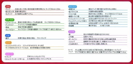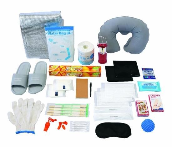材質:トートバッグ/ポリエステル・アルミ蒸着フィルム、歯磨き成分/ソルビトール・炭酸Ca・シリカ・グリセリン・ラウリル硫酸Na・水・PG・キシリトール・セルロースガム・ハッカ油・キサンタンガム・ステビアエキス・香科、割りばし/アスペン、スライドランタン/PP・PS・スチール、スリッパ/EVA、ラップ/ポリエチレン、笛/ABS樹脂、耳栓/ポリウレタン、アイマスク/ポリエステル、ネックピロー/PVC・ポリエステル、不織布マスク/本体:ポリプロピレン不織布、ワイヤー:ポリエチレン、耳ひも:ポリウレタン・ポリエステル、メモ帳/紙、ボールペン/PP、トイレットペーパー/再生紙100%、抗菌ウェットティッシュ/レーヨン・ポリエステル不織布、トランプ/紙、軍手/ポリエステル、簡易トイレ/高分ポリマー・ポリエチレン、3Lタンク/ポリエチレン、ゴミ袋/ポリエチレン、レジャーシート/アルミ・ポリウレタン、生理用品/ポリエステル・ポリエチレン、綿棒/綿・紙、ストレスボールPVC