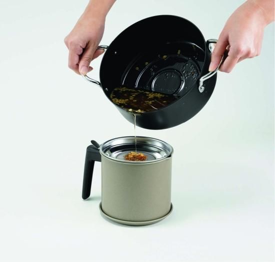 内容:揚げ物調理後の油を漉せるオイルポット。細かい網目皿で天カスも逃しません。ふっ素樹脂加工でお手入れも簡単です。