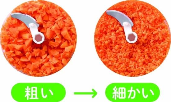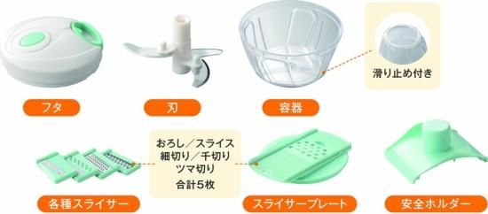 内容:煩わしさのあるみじん切りも数回引っ張るだけ、あっという間に完成!引く回数で粗さ調節可能。離乳食・介護食作りにも活躍!5種類のスライサー付きでレシピの幅が広がります!