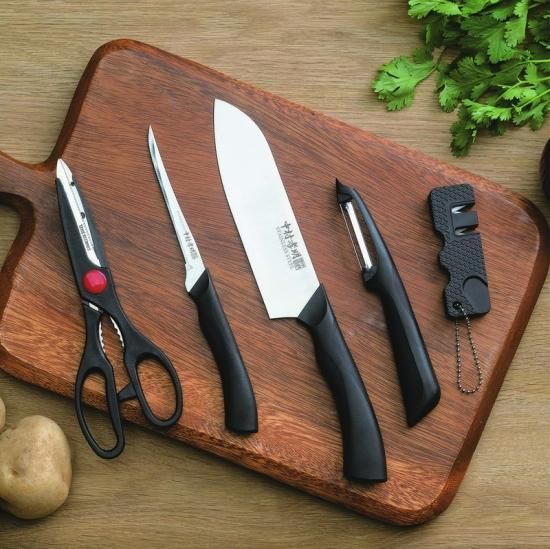 万能包丁、肉・野菜・魚など万能に。バケットナイフ、バケットのカットやトマトの薄切りに。キッチンバサミ、袋を切ったり、食材のカットにも。縦型ピーラー、野菜や果物の皮むき・芽とりに。ミニシャープナー、包丁の切れ味維持に。