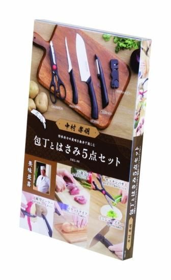 商品サイズ:万能包丁/43×295×18mm(刃渡り:160mm)、バケットナイフ/25×232×12mm(刃渡り:122mm)、縦型ピーラー/29×182×17mm、キッチンバサミ/74×210×12mm、ミニシャープナー/91×31×13mm