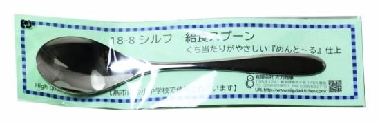 内容:新潟県燕市内の小中学校で使用されています。軽量化されていますので、低学年層にも持ちやすくできています。スプーンの皿周りに面取り加工を施していますので、口当たりが良いです。