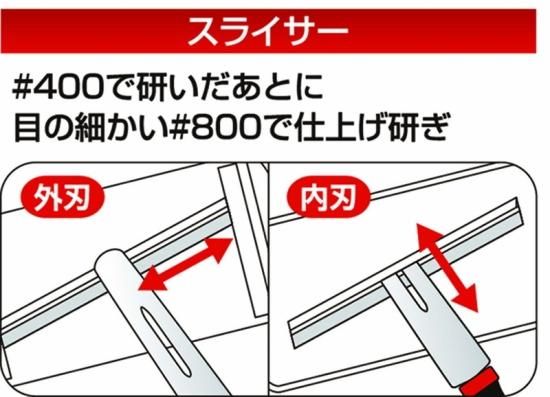 内容:表面#400は包丁・ハサミ・鎌等に、裏面#800はスライサーの仕上げ磨きに。スライサーの切れ味が驚くほどよみがえる!軽くて薄い。水を使わずなぞるだけ。