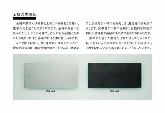 内容:金属の黒染めは塗料を上塗りする塗装とは違い、化学反応を起こして黒く染めます。金属の風合いを生かした仕上がりが可能で、光沢のある金属は光沢のある黒に。マットな金属はマットな黒に仕上がります。ムラや液ダレ跡、孔食と呼ばれる斑点が出るなど、塗装のように均一的な質感ではありませんが、黒染めにしか出せない味のある美しさ、温度感のある黒になります。無機質な印象の金属に、有機的な特性が加わり、個性的で温もりのある黒が生み出されるのです。染めを施した製品を日常で使ってもらう事で、もっと多くの人に黒染めの美しさを知ってもらいたい。この先もずっとこの技術を残したい。そう思っています。