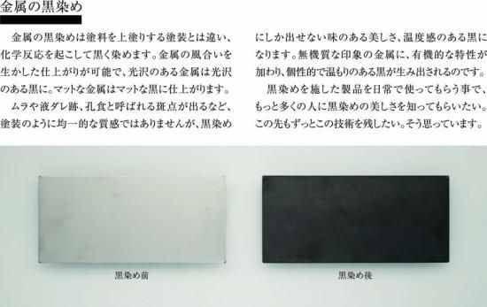 内容:金属の黒染めは塗料を上塗りする塗装とは違い、化学反応を起こして黒く染めます。金属の風合いを生かした仕上がりが可能で、光沢のある金属は光沢のある黒に。マットな金属はマットな黒に仕上がります。ムラや液ダレ跡、孔食と呼ばれる斑点が出るなど、塗装のように均一的な質感ではありませんが、黒染めにしか出せない味のある美しさ、温度感のある黒になります。無機質な印象の金属に、有機的な特性が加わり、個性的で温もりのある黒が生み出されるのです。染めを施した製品を日常で使ってもらう事で、もっと多くの人に黒染めの美しさを知ってもらいたい。この先もずっとこの技術を残したい。そう思っています。