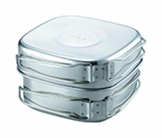 内容:角型鍋・角型フライパン・皿×2・マグ×2のペアで使えるキャンピング鍋6点セット。鍋は袋麺が入るサイズです。鍋はコンパクトに収納できます。