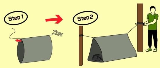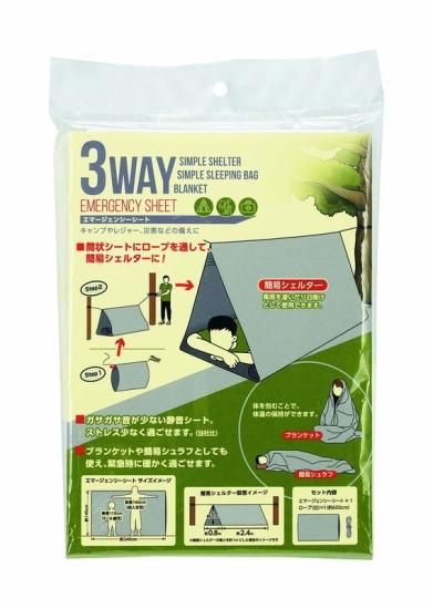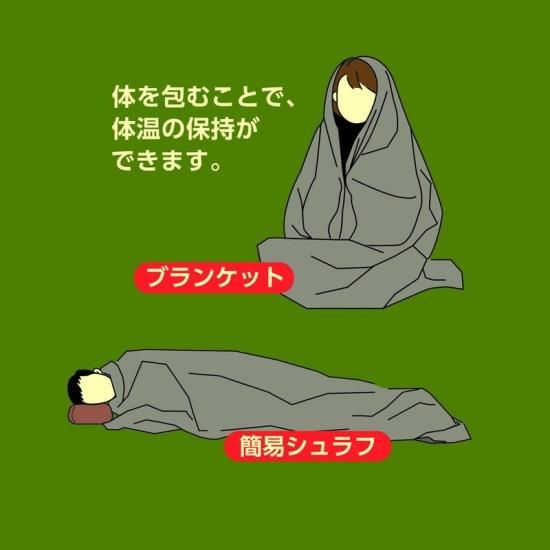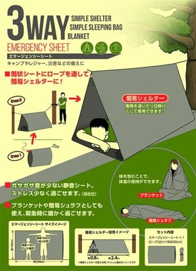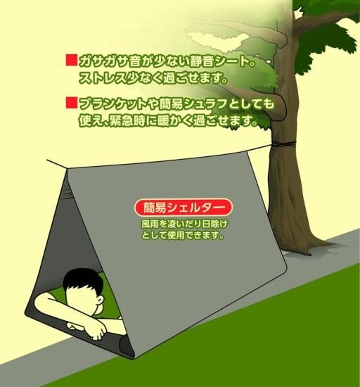 内容:筒状シートにロープを通して、簡易シェルターに!風雨を凌いだり日除けとして使用できます。ブランケットや簡易シュラフとして体を包むことで、体温の保持ができます。ガサガサ音が少ない静音シートでストレス少なく過ごせます。キャンプやレジャー、災害などの備えに!
