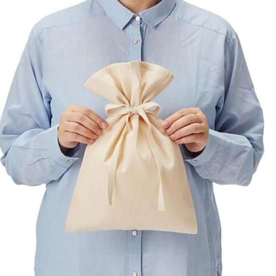巾着紐をリボンとして結べるようにしたコットン素材のラッピング巾着です。