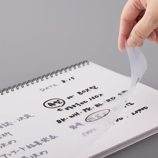 ホワイトボード面に書き込んだ文字や図の上から、透明シートとの間に資料を挟んでその上から文字や図を書き込むことができたり、付箋を貼るなどアイデア次第でいろいろな使い方ができます。