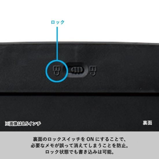 本体裏側のスイッチで書いたメモが消えないようになるロック機能付き。