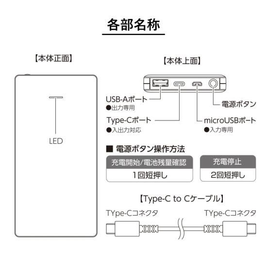 備考:取説付 最大出力3A バッテリー容量10000mAh 本体重量約240g Type-Cケーブル付属
