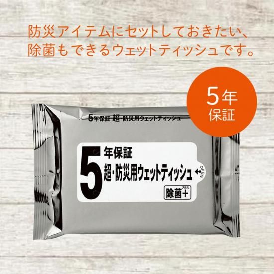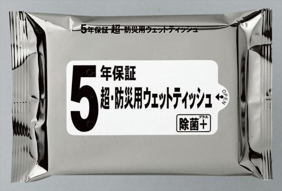5年保証の防災アイテムに加えたい防災用ウェットティッシュです。