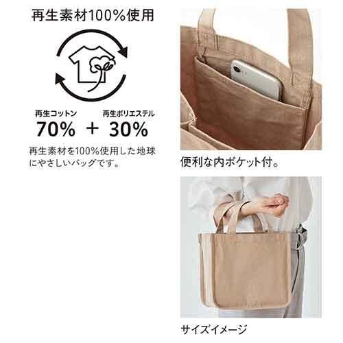 しっかりとしたキャンバス地なのでお出かけだけではなくツールトートとしても活躍!再生コットンと再生ポリエステルを使用した、100%再生素材のトートです