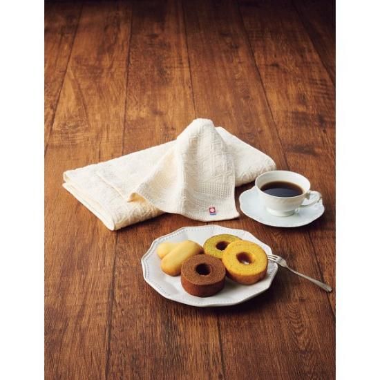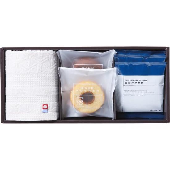 ●今治産ウォッシュタオル(約34×35┣cm┫・綿100%・日本製)1枚・ミニバウム(バニラ×1・チョコ×1)・ドリップコーヒー8┣g┫×3