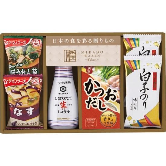●キッコーマンいつでも新鮮しぼりたて生しょうゆ200┣ml┫、白子のり味のり(8切5枚)×2、メイワかつおだし(4┣g┫×6)、アマノフーズフリーズドライいつものおみそ汁(なす・ほうれん草)×各1