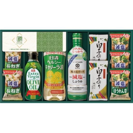 ●キッコーマンいつでも新鮮味わいリッチ減塩しょうゆ450┣ml┫、アマノフーズフリーズドライ減塩いつものおみそ汁(ほうれん草×3・長ねぎ×2)、白子のり味のり(8切5枚)×2、日清ヘルシーキャノーラ油350┣g┫、日清エキストラバージンオリーブ油145┣g┫