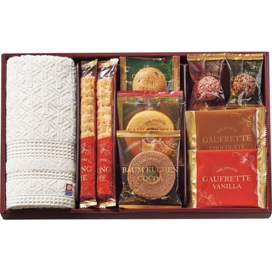 ●チョコチップクッキー×1・ロングスティックパイ×2・バウムクーヘン(ココア)×1・バウムクーヘン(バニラ)×1・ゴーフレット(チョコ)×1・ゴーフレット(バニラ)×1・チョコレートクランチ(ミルク)×1・チョコレートクランチ(ストロベリー)×1・ウォッシュタオル(約34×35┣cm┫・綿100%・日本製)×1
