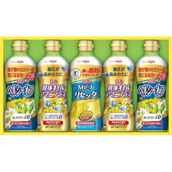 体に脂肪がつきにくいMCTリセッタ、血圧が高めな方におすすめのアマニプラスなどヘルシーオイルの詰合せギフトです。