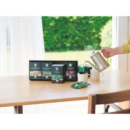 ゆっくり流れる時間を贈ろう。スターバックスで感じる、ゆっくりと流れる時間。そんな贅沢な時間が家でも味わえる、スターバックスのギフト。今年は、かけがえのない「時間」を贈りませんか。一杯分の美味しさを味わえるドリップタイプのスターバックスオリガミ。一滴一滴を丁寧に淹れる贅沢な時間を、定番から深煎りコーヒーまで豊富なフレーバーでお楽しみいただけます。人気のフレーバー4種の詰合せです。どなたにもご満足いただける組み合わせで、本格的な香りと味わいを飲み比べてみたり、お好みを見つけていただくのに最適なセットです。