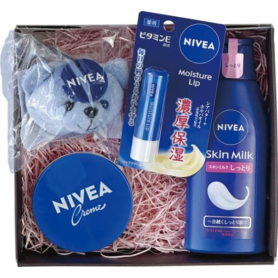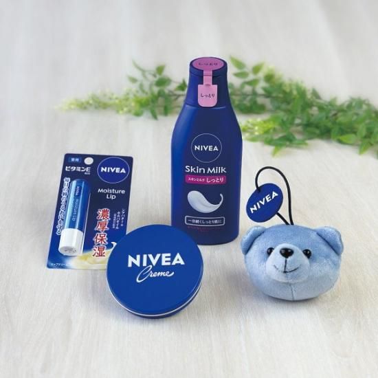 ●セット内容=ニベアクリーム56┣g┫×1、モイスチャーリップ3.9┣g┫×1、スキンミルク200┣g┫×1、ニベアくまマスコット×1