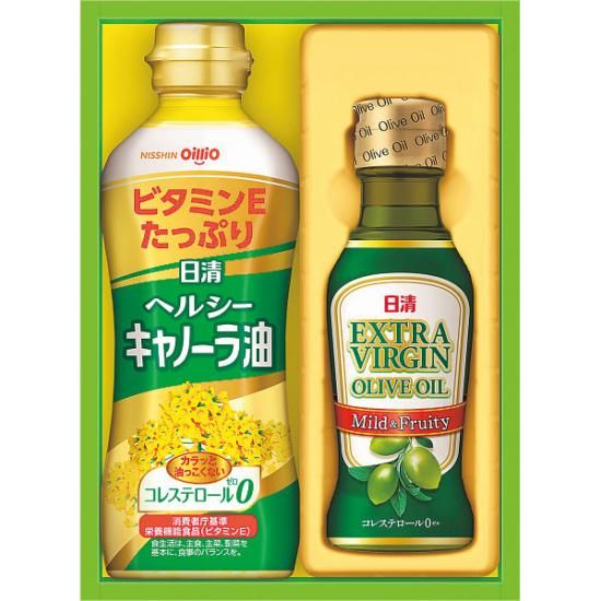 ●日清へルシーキャノーラ油350┣g┫×1、日清エキストラバージンオリーブオイル145┣g┫×1
