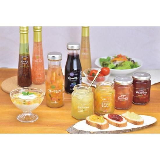 ●ジャム145┣g┫×3(いちご、ラ・フランス、さくらんぼ)、ミックスジャム155┣g┫フルーツキューブ、フルーツソース×2(フルーツミックス215┣g┫、ブルーベリー220┣g┫)、ドレッシング122┣ml┫×3(オニオンハーブ、ノンオイル大根と人参、焙煎ごま)
