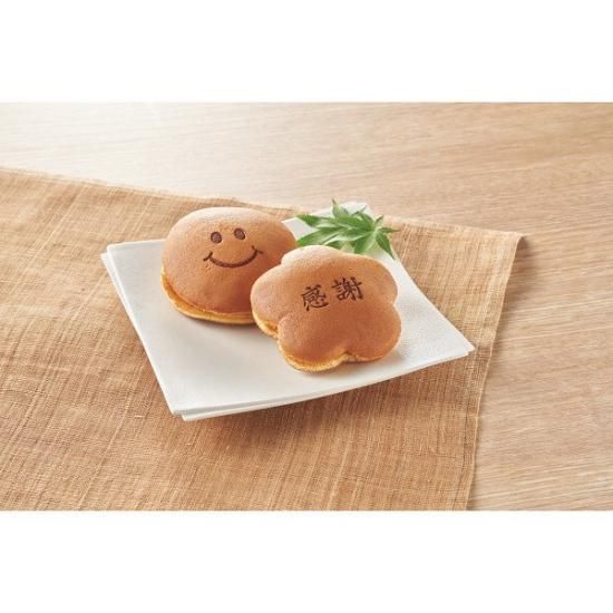 北海道産小豆、国内産小麦粉を使用した。ふっくら、しっとり、やわらか風味豊かなどら焼きになります。スマイルマークと梅型に感謝の焼印を押しました。