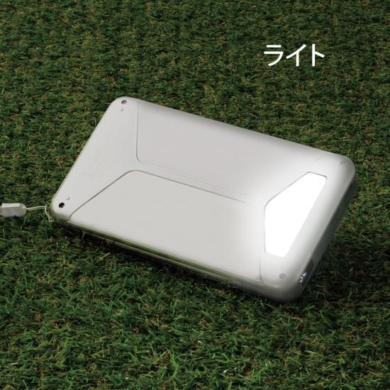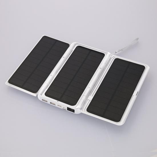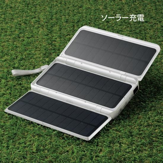 "パネル3枚で太陽光をしっかりキャッチ。バッテリーは10000mAhと大容量で背面にはライト機能もあり、アウトドアや非常時に最適。
