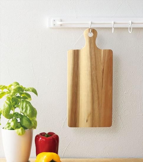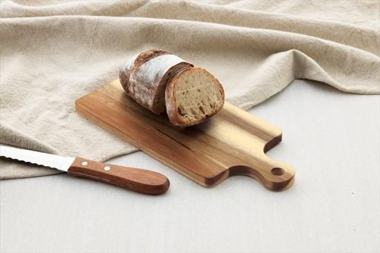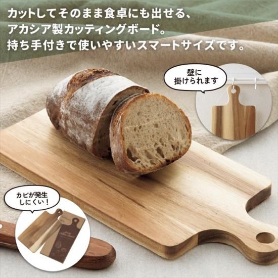 カットしてそのまま食卓にも出せる、アカシア製カッティングボード。持ち手付きで使いやすいスマートサイズです。