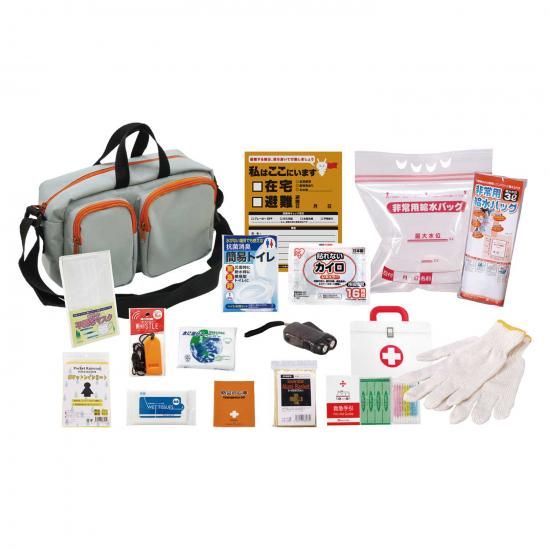 収納ショルダーバッグ・防災の心得・ホイッスル・カイロ・レインコート・抗菌消臭簡易トイレ1P・ダイナモLEDライト・アルミブランケット・マスク・給水袋3L・緊急避難カード・除菌アルコールウェットティッシュ・水に流せるペーパー・救急4点セット・軍手