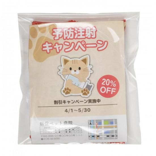 透明の袋に有名メーカーの商品と貴社オリジナルのラベル(チラシ)をセットしてお届けします♪