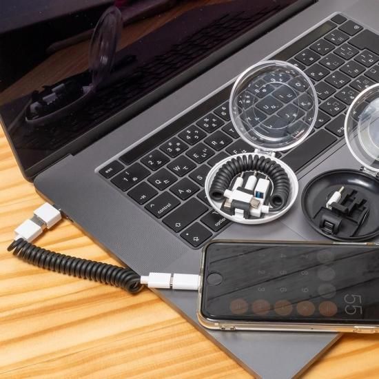 3種類の変換プラグ付きで様々なポート形状に対応します。ケーブルは伸縮性があるコイル状なのでコンパクトに携帯できます。
