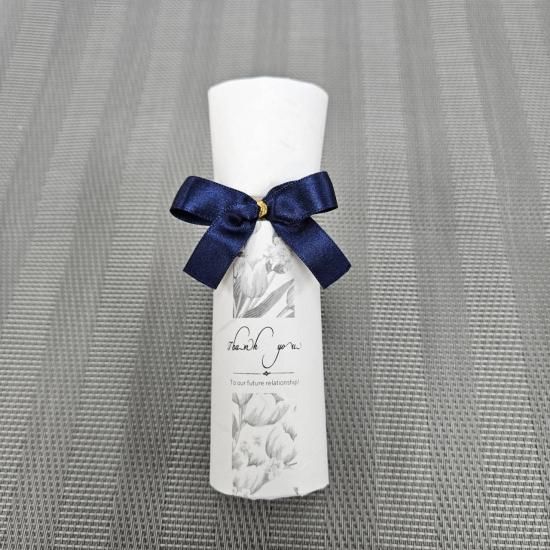 モノトーンの花柄パッケージにネイビーのリボンで落ち着いた色合いのエレガントなプチギフトです。