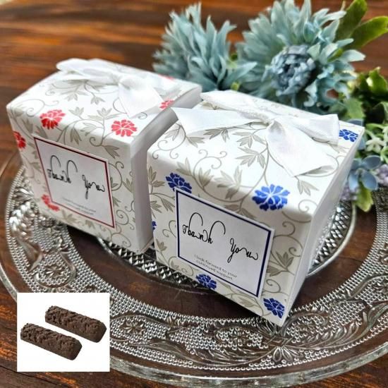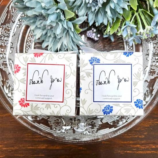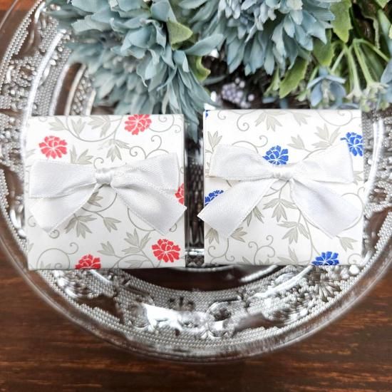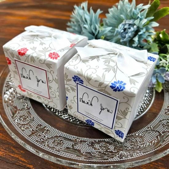 赤と青のかわいいお花がエレガントなパッケージのプチギフトです。