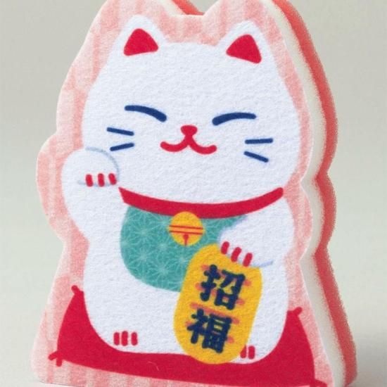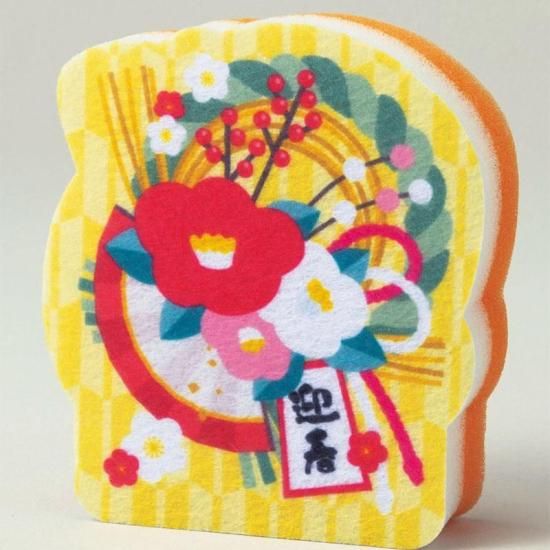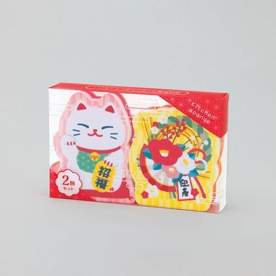 かわいい招き猫と華やかなお正月飾りのデザイン。ボリュームのある、2層構造のキッチンスポンジです。