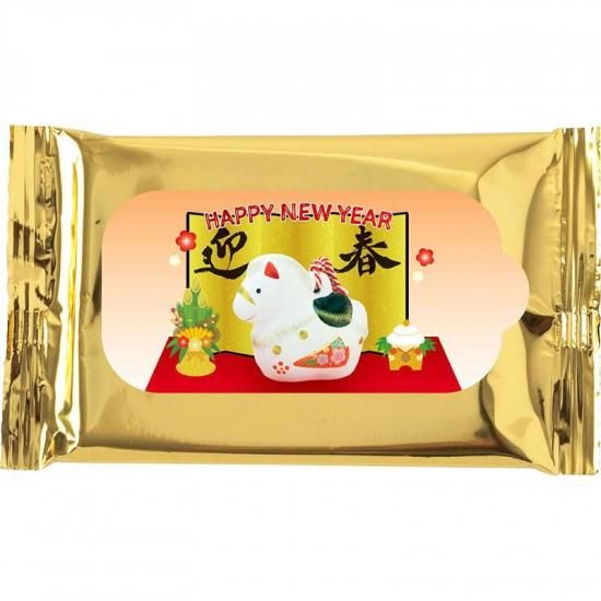 縁起のいい干支がデザインされたゴールドのパッケージ。携帯に便利なウエットティッシュです。